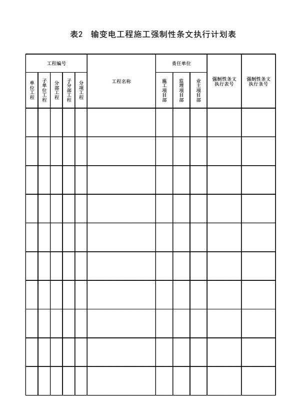 表格名称:表2 输变电工程施工强制性条文执行计划表