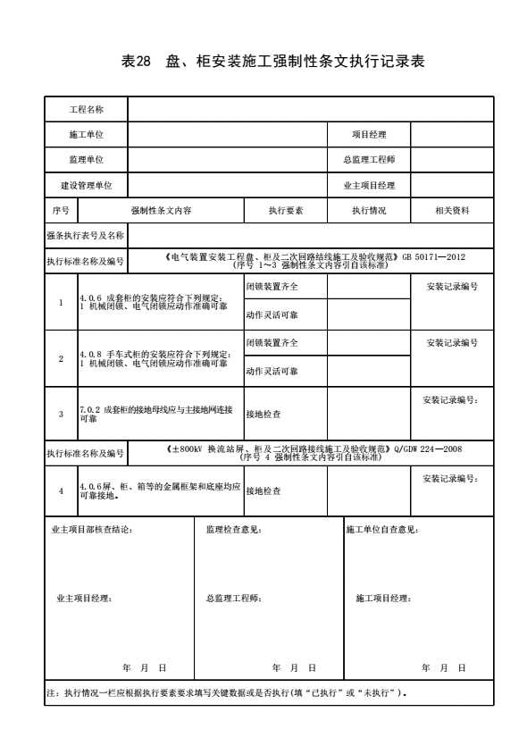 表格名称:表28 盘、柜安装施工强制性条文执行记录表
