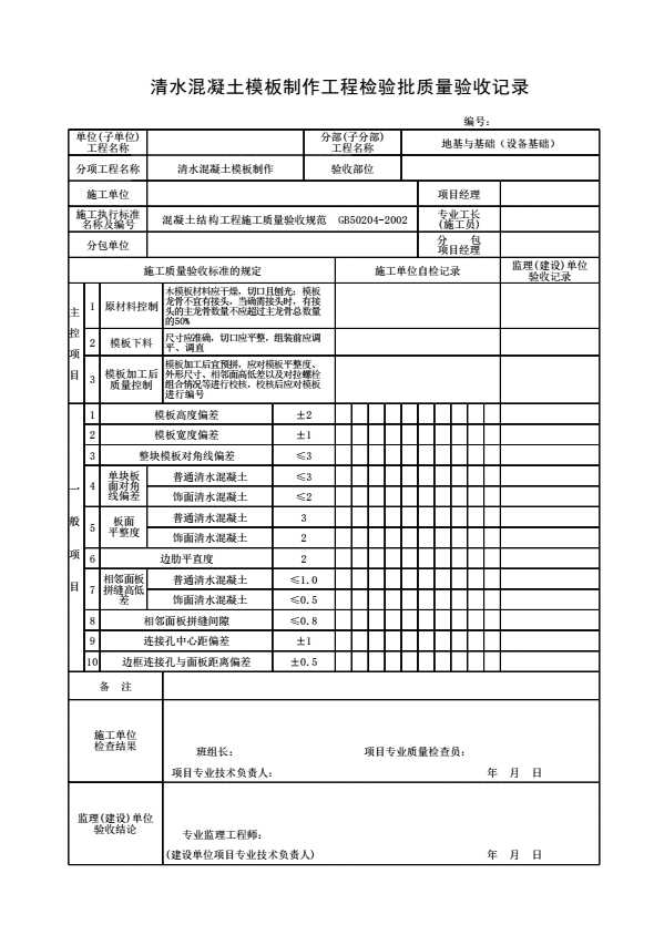 表格名称:清水混凝土模板制作工程检验批质量验收记录