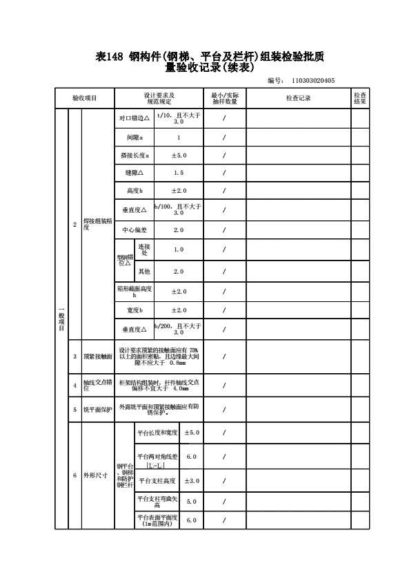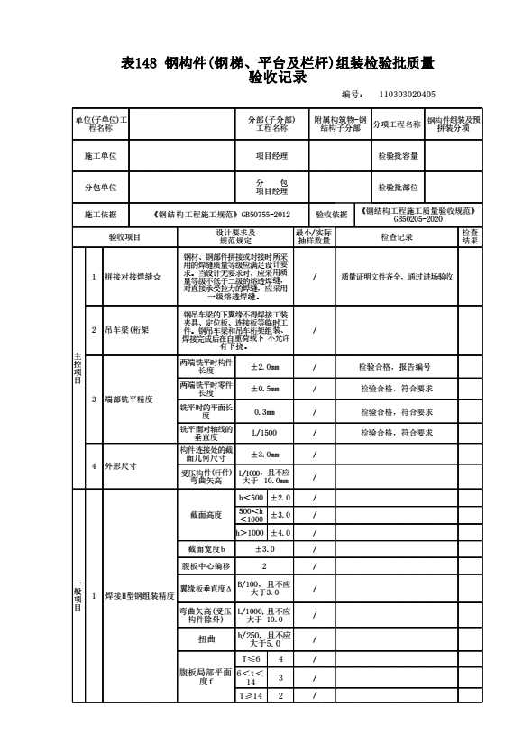 表格名称:110303020405 钢构件(钢梯、平台及栏杆)组装检验批质量验收记录