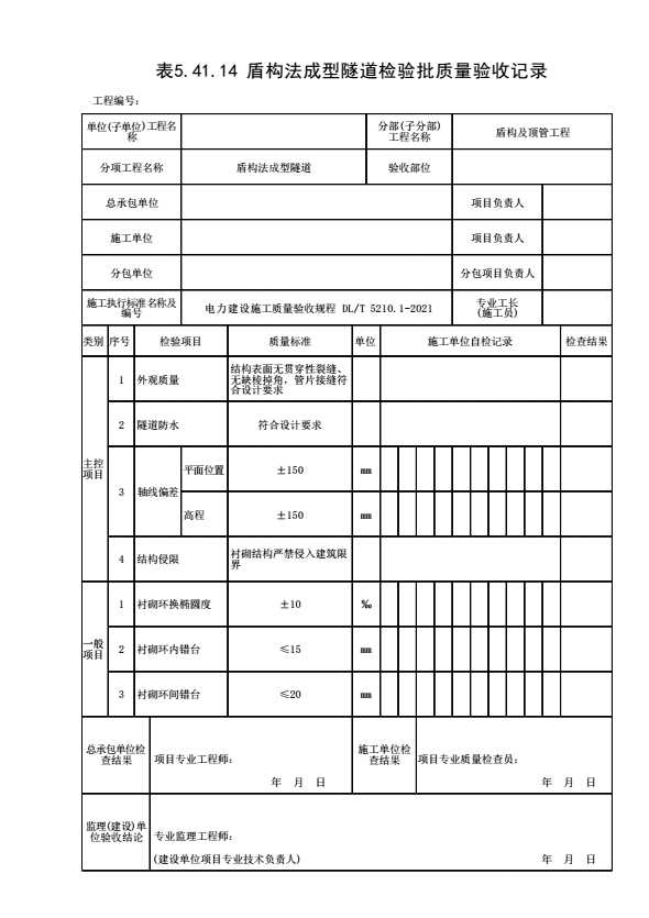表5.41.14 盾构法成型隧道检验批质量验收记录