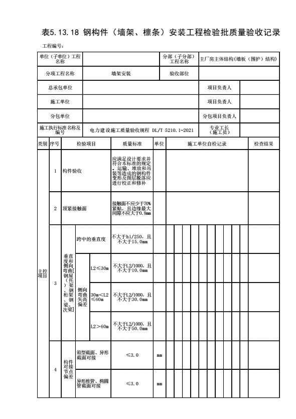 表格名称:【符合表5.13.18】表6.5.18钢构件(墙架、檁茶)安装工程检验批质量验收记录