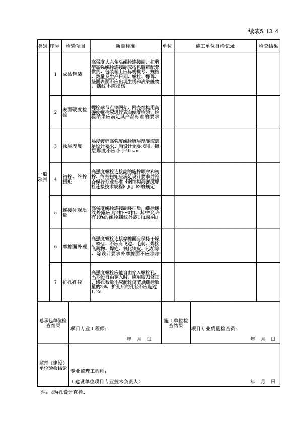 表格名称:[符合表5.13.4]表6.10.21高强螺栓连接工程检验批质量验收记录