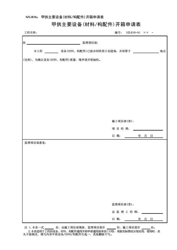 表格名称:SZLB10:甲供主要设备(材料构配件)开箱申请表