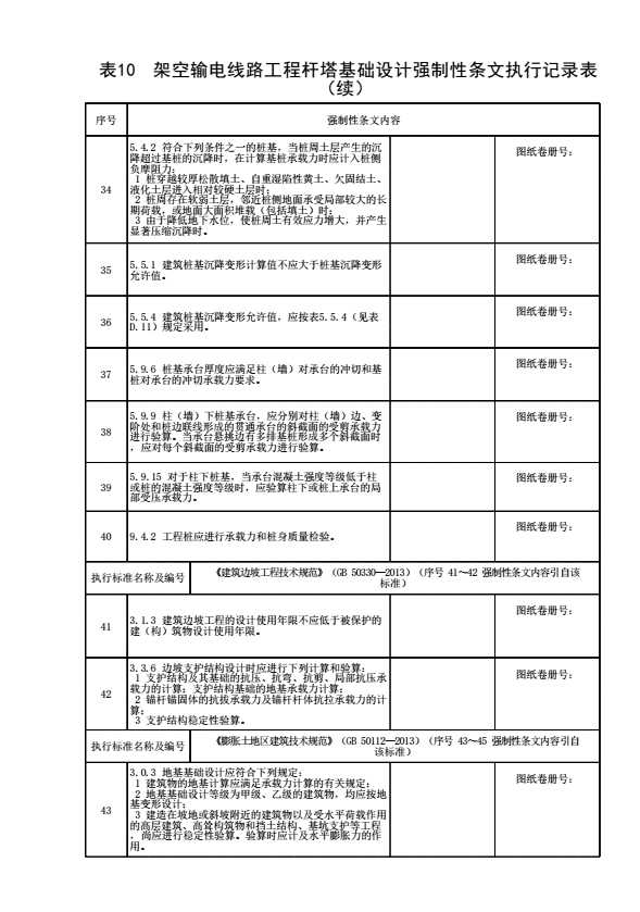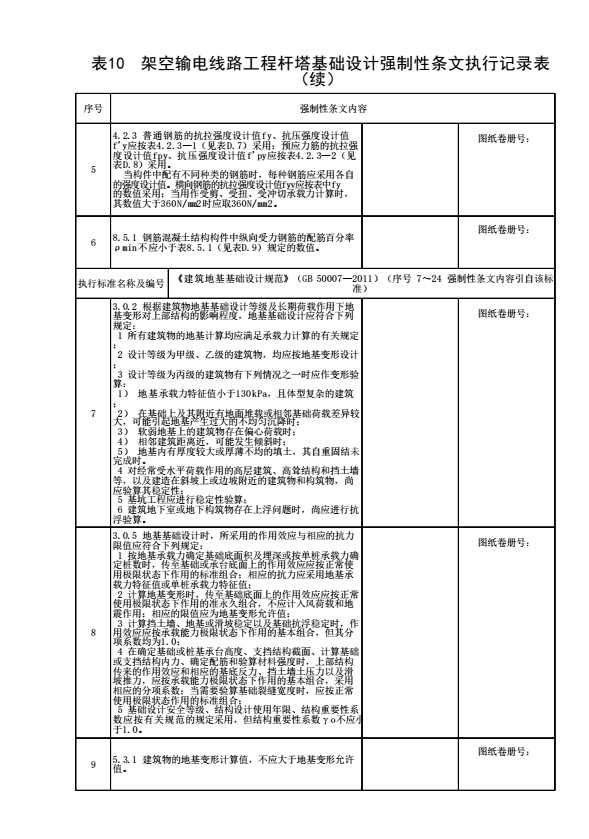 表格名称:表10 架空输电线路工程杆塔基础设计强制性条文执行记录表