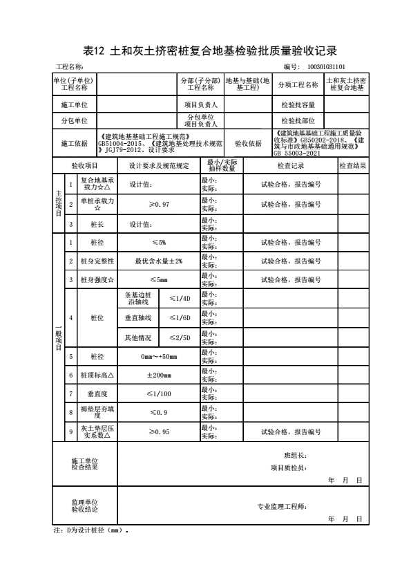 表格名称:100301031101 土和灰土挤密桩复合地基检验批质量验收记录