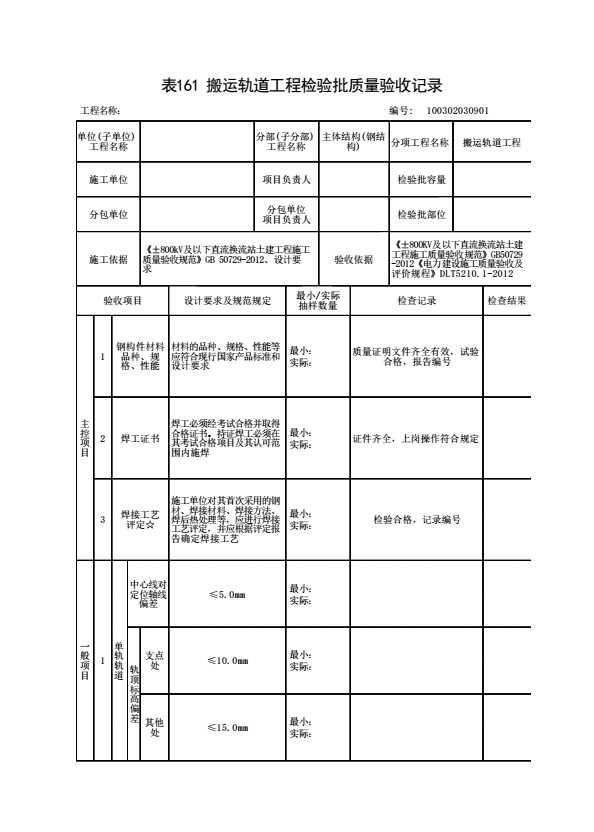 表格名称:100302030901 搬运轨道工程检验批质量验收记录