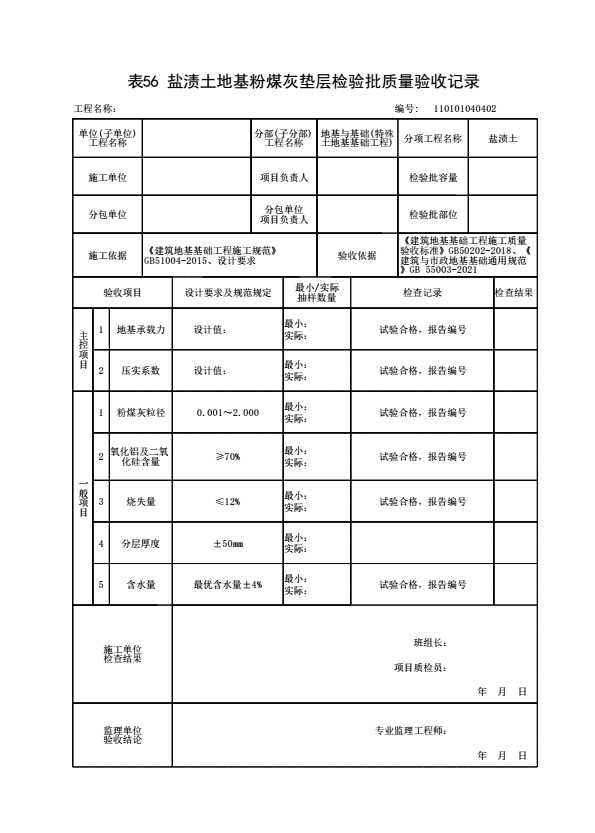 表格名称:110101040402 盐渍土地基粉煤灰垫层检验批质量验收记录