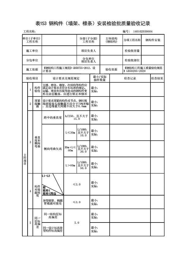 表格名称:140102030604 钢构件(墙架、檩条)安装检验批质量验收记录