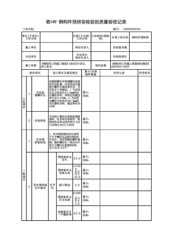 表格名称:140202030501 钢构件预拼装检验批质量验收记录