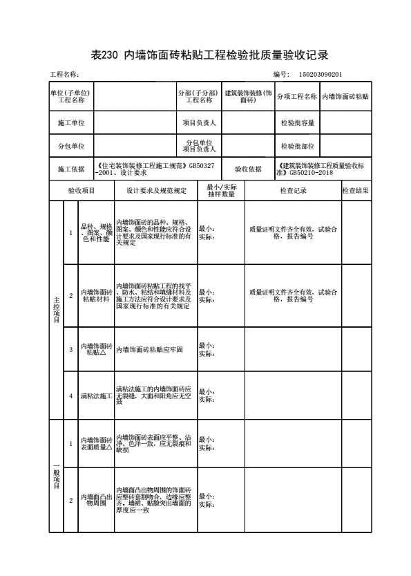 表格名称:150203090201 内墙饰面砖粘贴工程检验批质量验收记录
