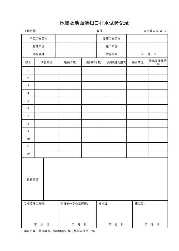 表格名称:电土施表13.3-12 地漏及地面清扫口排水试验记录