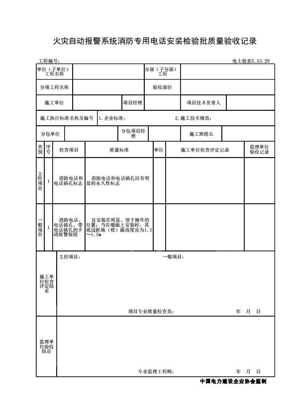 表格名称:电土验表5.33.29 火灾自动报警系统消防专用电话安装检验批质量验收记录