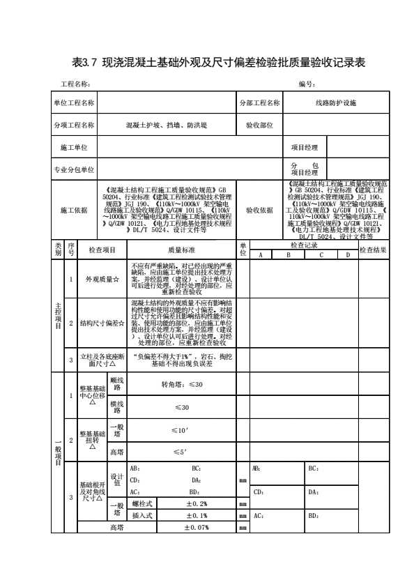 表格名称:表3.7 现浇混凝土基础外观及尺寸偏差检验批质量验收记录表