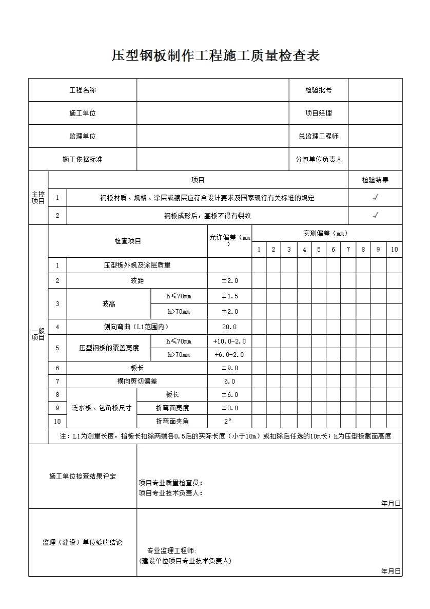 表格名称:压型钢板制作工程施工质量检查表