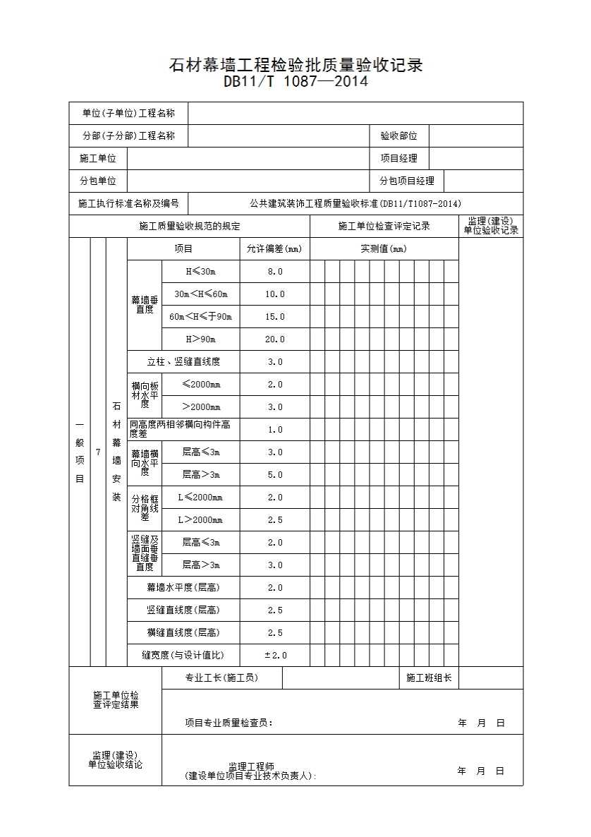 表格名称:石材幕墙工程检验批质量验收记录