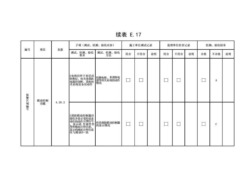 表格名称:表E.17 电梯、非消防电源等相关系统联动控制调试、检测、验收记录(续表1)