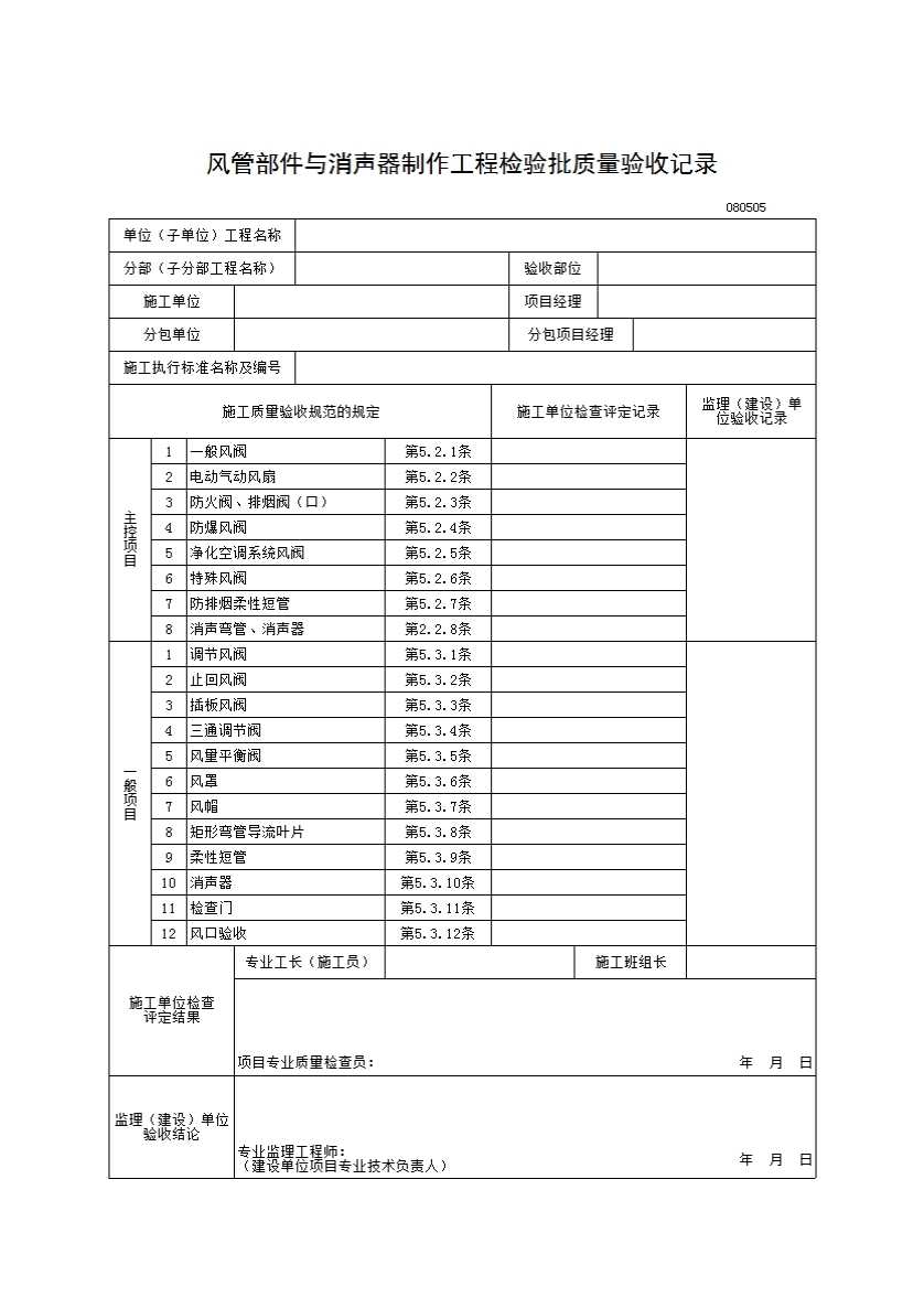 表格名称:风管部件与消声器制作工程检验批质量验收记录