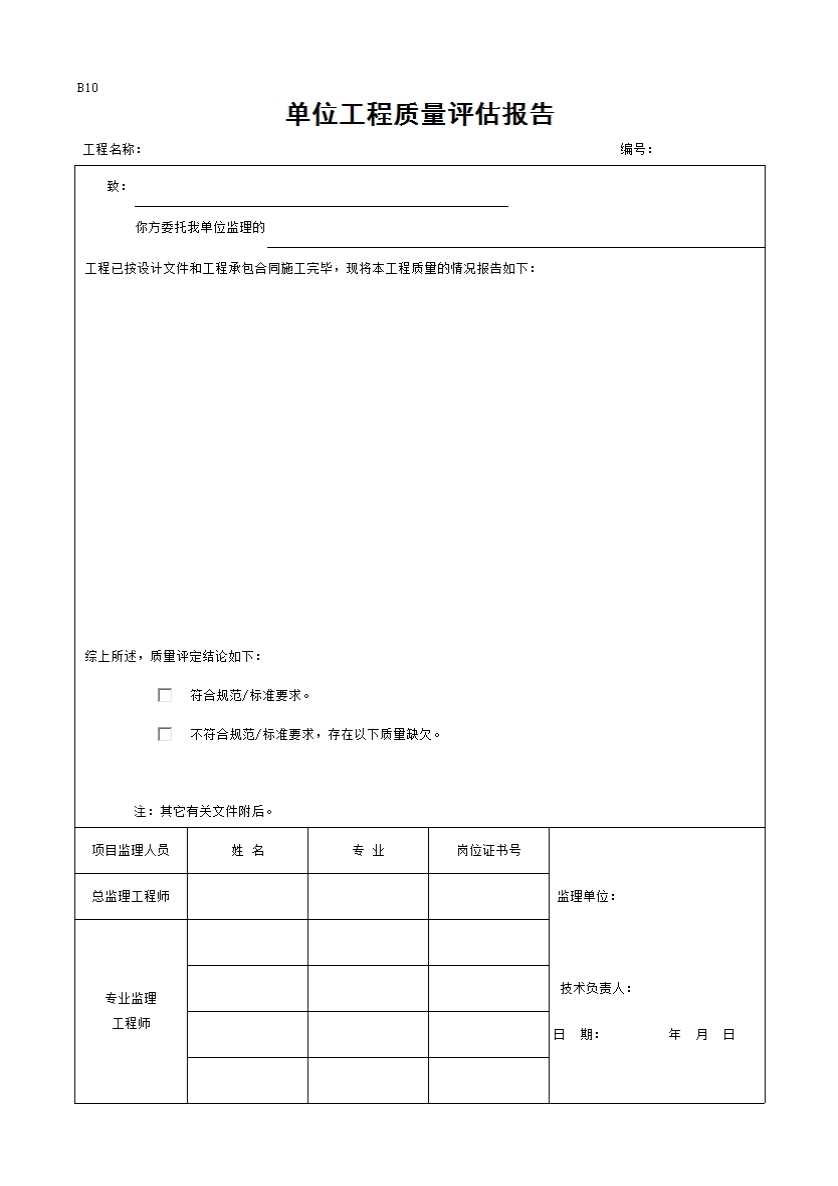 表格名称:B10 单位工程质量评估报告