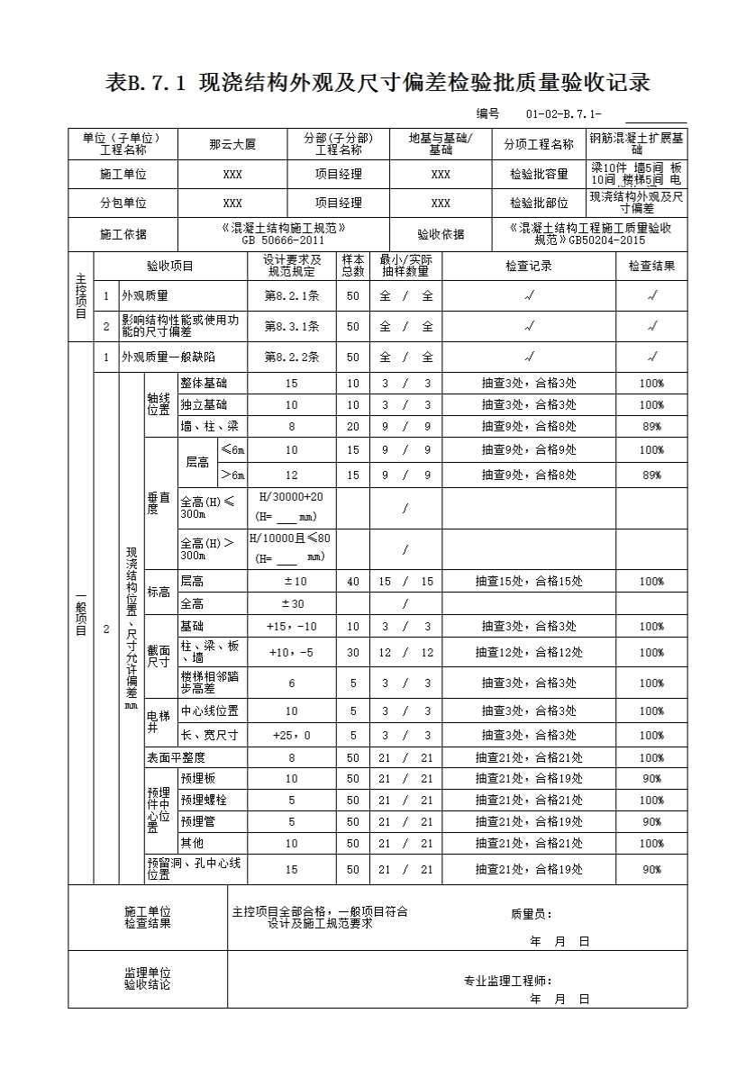 现浇结构外观及尺寸偏差检验批质量验收记录