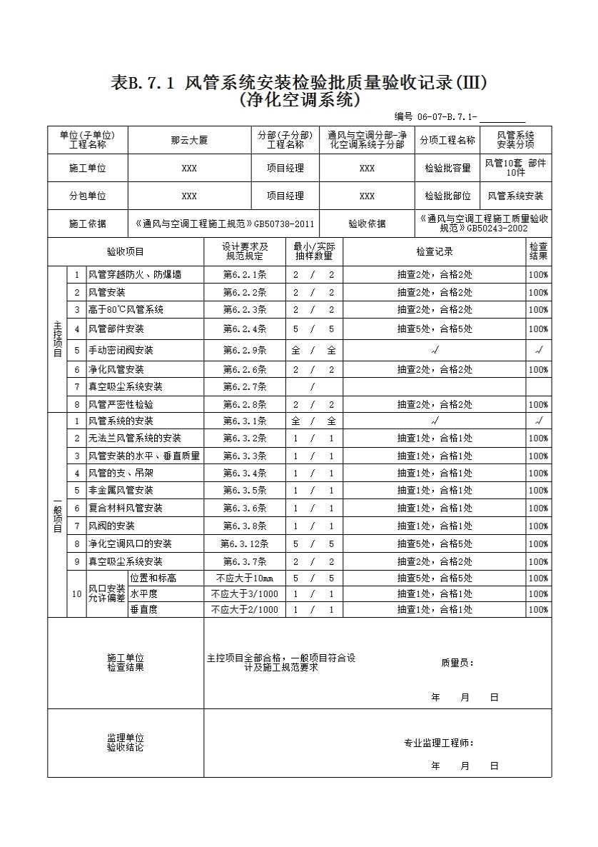 06070301_风管系统安装检验批质量验收记录(Ⅲ)(净化空调系统)