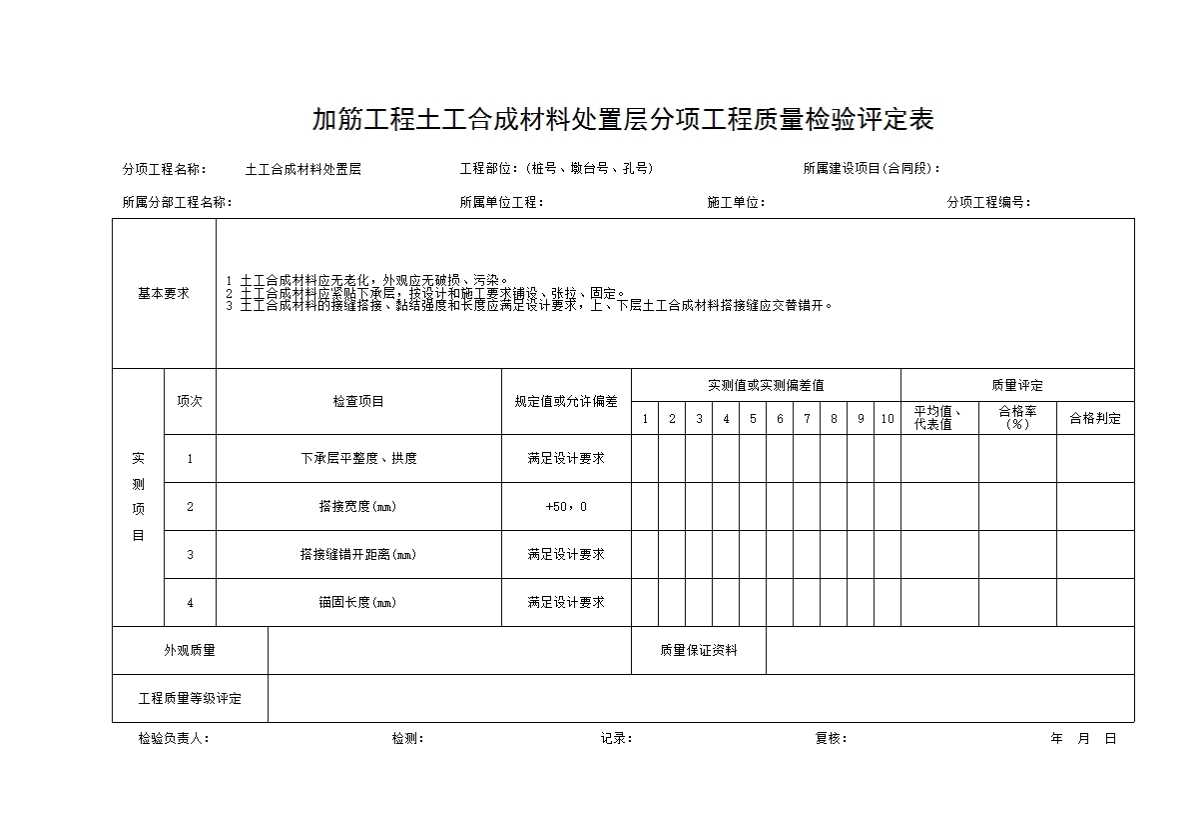 加筋工程土工合成材料处置层分项工程质量检验评定表