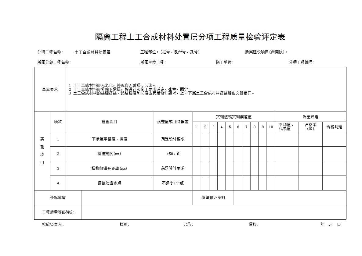 隔离工程土工合成材料处置层分项工程质量检验评定表