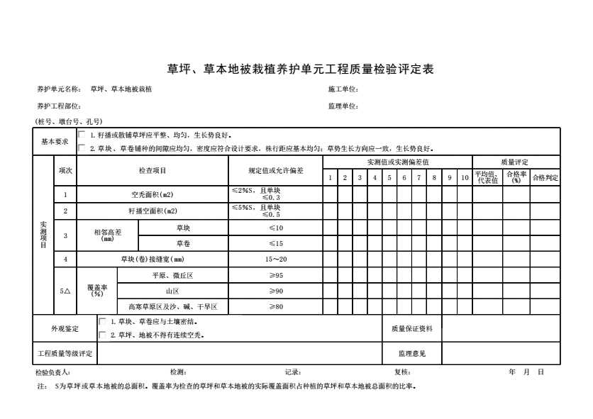 表格名称:草坪、草本地被栽植养护单元工程质量检验评定表