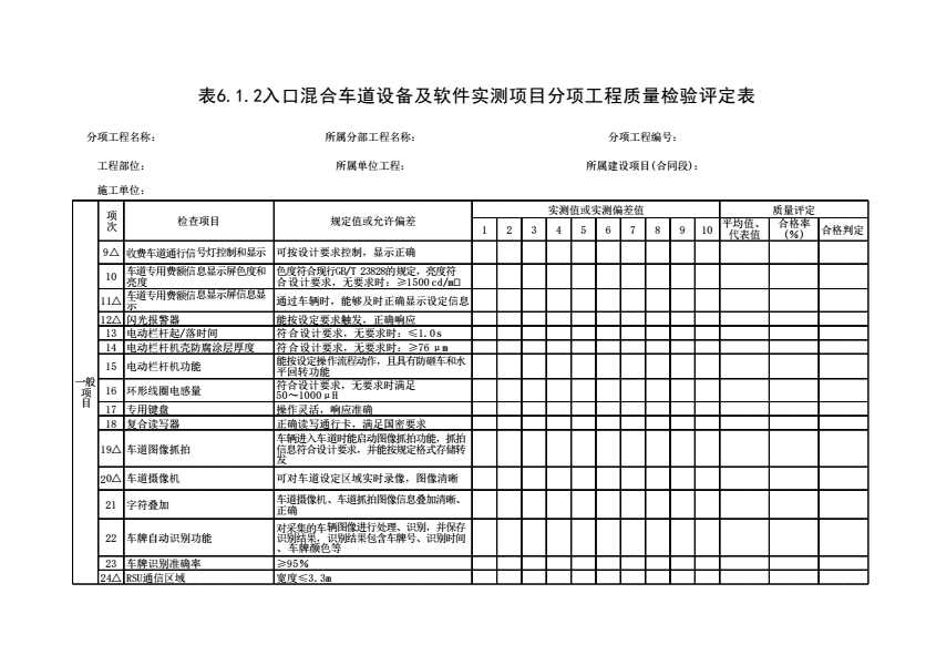 表格名称:表6.1.2 入口混合车道设备及软件实测项目分项工程质量检验评定表