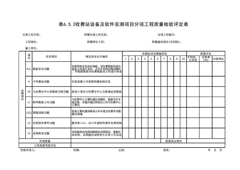 表格名称:表6.5.2 收费站设备及软件实测项目分项工程质量检验评定表