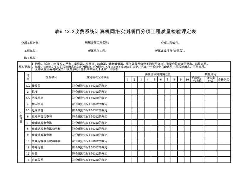 表格名称:表6.13.2 收费系统计算机网络实测项目分项工程质量检验评定表