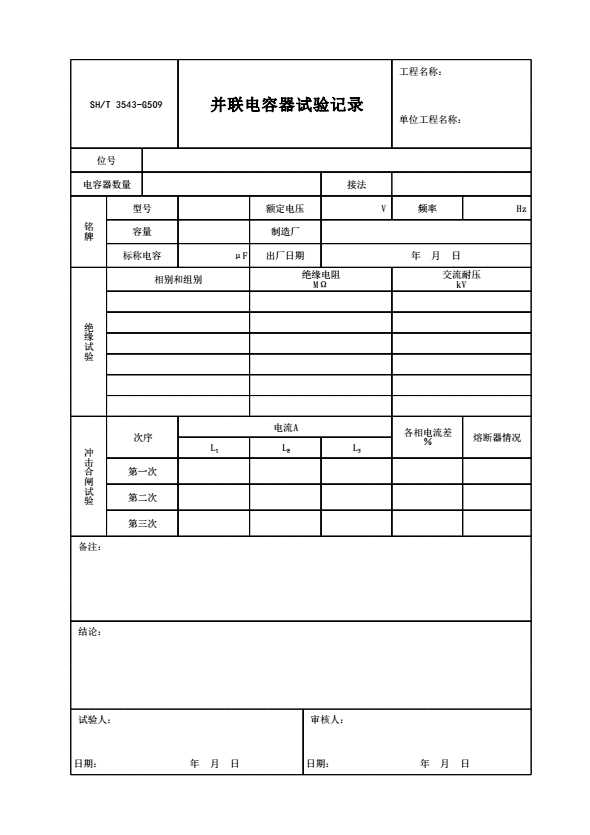 表格名称:SH/T 3543-G509 并联电容器试验记录