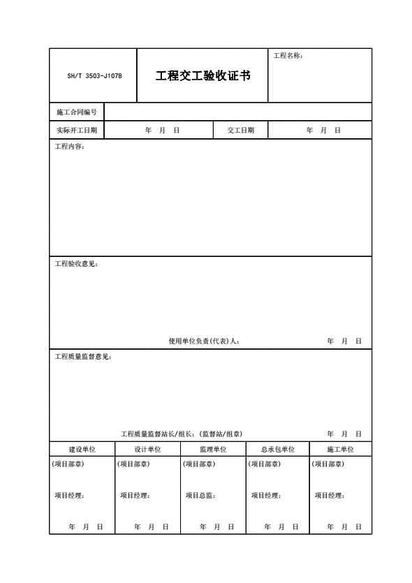 表格名称:SH/T 3503-J107B 工程交工验收证书