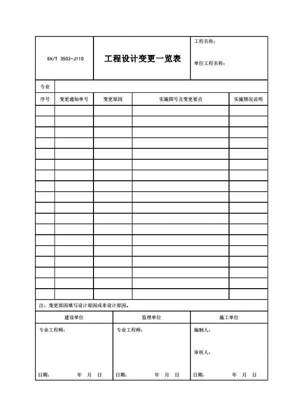 表格名称:SH/T 3503-J110 工程设计变更一览表
