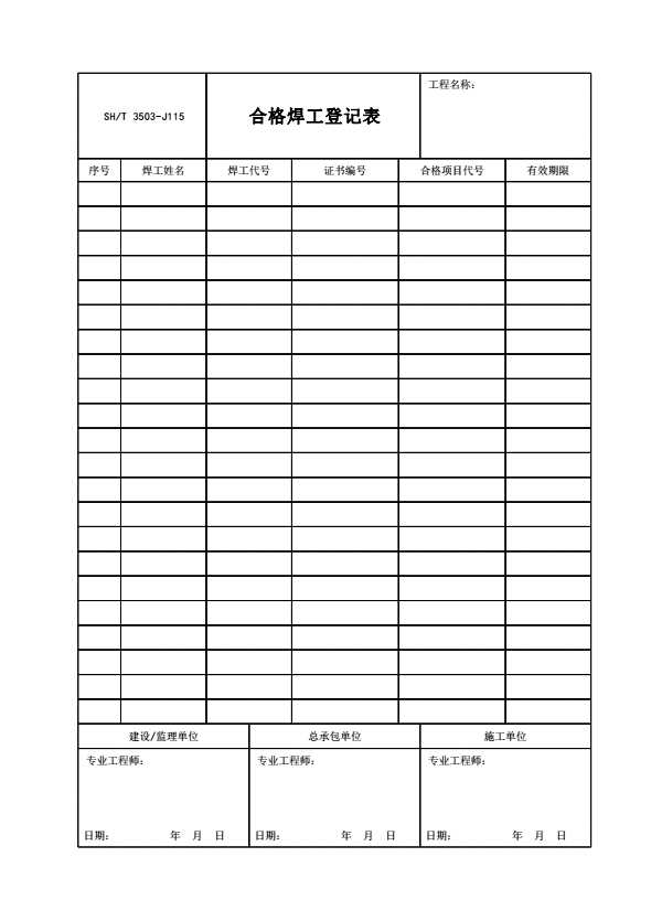 SH/T 3503-J115 合格焊工登记表