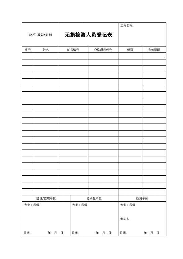 表格名称:SH/T 3503-J116 无损检测人员登记表
