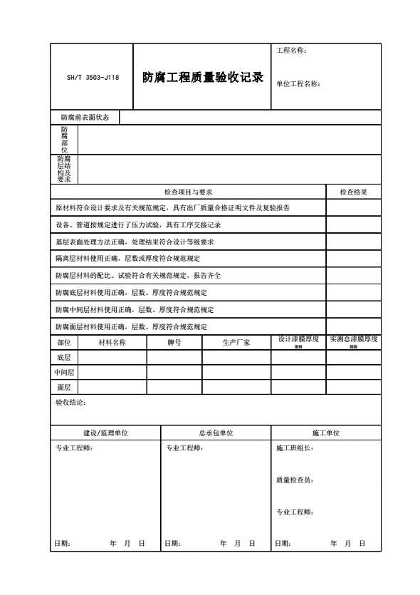 表格名称:SH/T 3503-J118 防腐工程质量验收记录