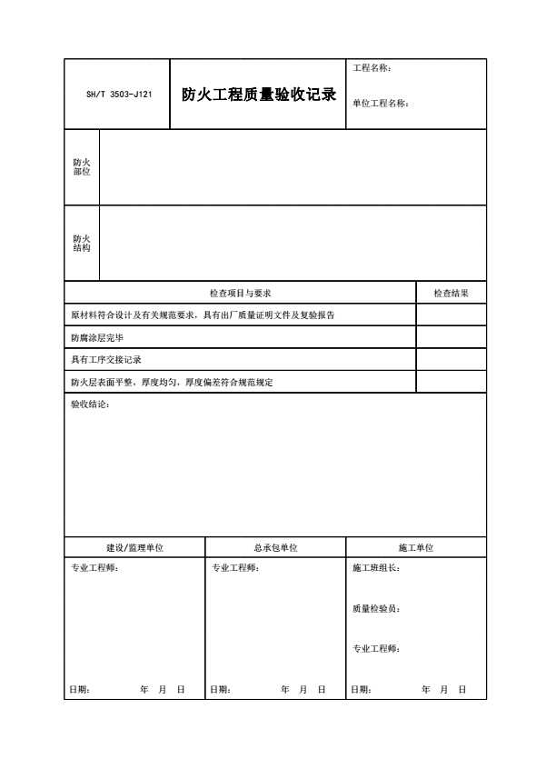表格名称:SH/T 3503-J121 防火工程质量验收记录