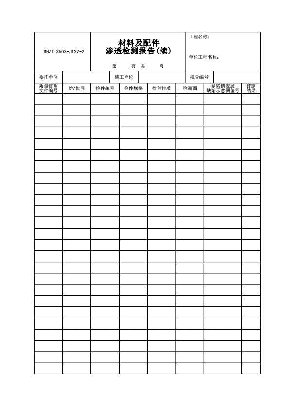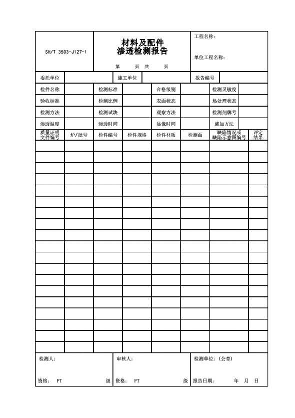 表格名称:SH/T 3503-J127 材料及配件渗透检测报告