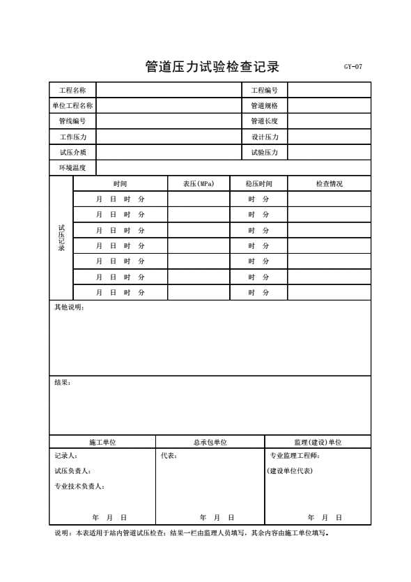 表格名称:GY-07 管道压力试验检查记录