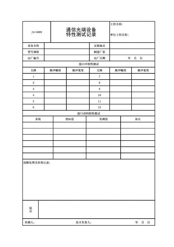 表格名称:J4-5009 通信光端设备特性测试记录