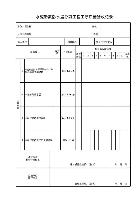 11.4 水泥砂浆防水层分项工程工序质量验收记录表