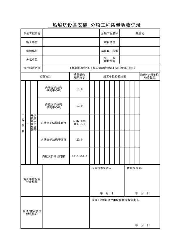表格名称:热焖坑设备安装分项工程质量验收记录