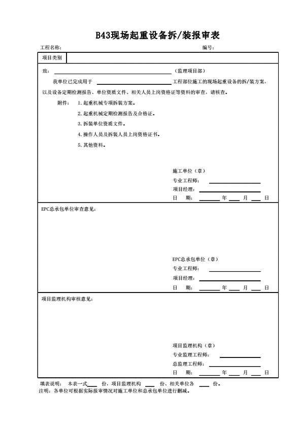 表格名称:B43现场起重设备拆/装报审表