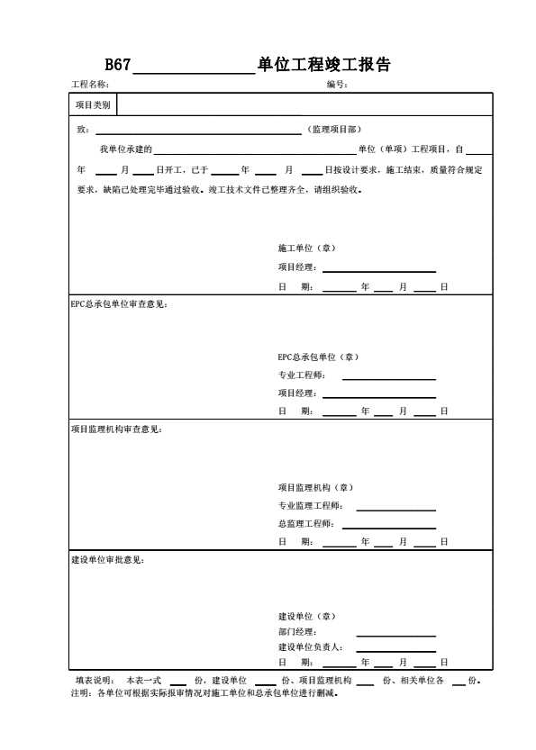 表格名称:B67单位工程竣工报告