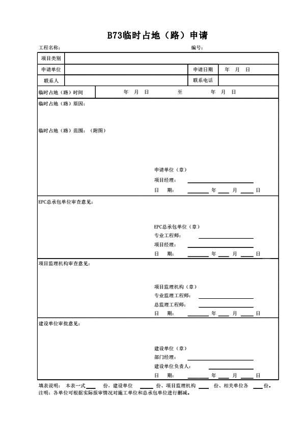 表格名称:B73临时占地(路)申请