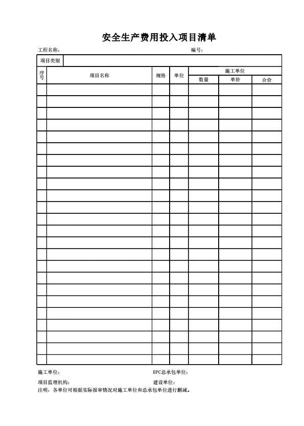 表格名称:安全生产费用投入项目清单
