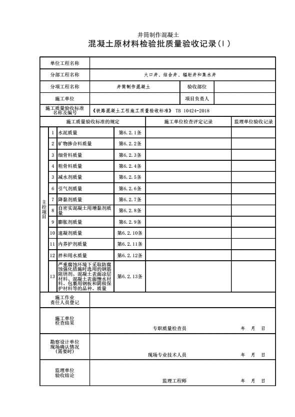 【井筒制作混凝土】混凝土原材料检验批质量验收记录(Ⅰ)
