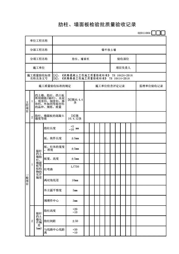 表格名称:02011004 肋柱、墙面板检验批质量验收记录