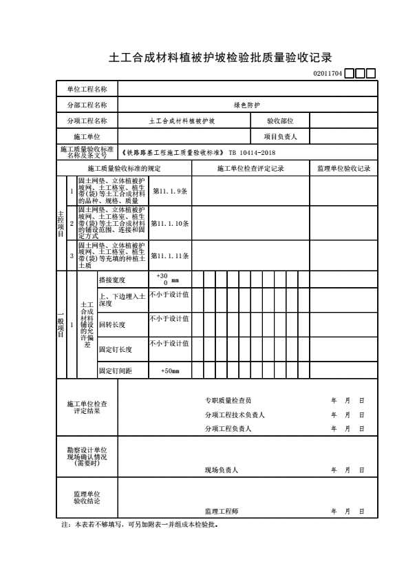 表格名称:02011704 土工合成材料植被护坡检验批质量验收记录